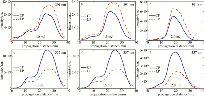 沿著光的傳播方向移動光纖探頭,可以測量飛秒光絲不同位置處的熒光信號。如圖 3所示,為入射激光能量分別為1.0 mJ,1.5 mJ和2.0 mJ時,激光的偏振態分別為線偏振和圓偏振情況下,測量得到391 nm處的N2+熒光信號強度和337 nm處的N2熒光信號強度隨光傳輸距離的變化。可以發現,在3種不同的入射激光能量下,光絲中心位置處337 nm的熒光信號在圓偏振光作用下的強度約為線偏振態下的2倍,而391 nm的熒光信號則是在線偏振態下的強度約為圓偏振光下的1.3倍。隨著入射激光單脈沖能量的增加,熒光強度的較大值在逐漸增加。