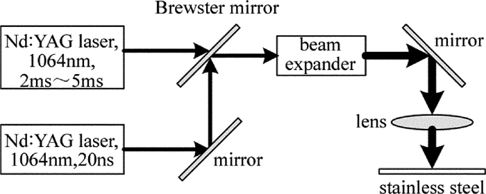 復(fù)合激光脈沖打孔實(shí)驗(yàn)裝置如圖 1所示。兩束激光波長均為1064nm,毫秒激光脈寬2ms~5ms可調(diào),頻率為30Hz,單脈沖能量為2J~5J,聚焦光斑為300μm,納秒激光脈寬為20ns,頻率為10kHz,單脈沖能量為1.5mJ,聚焦光斑為100μm。兩束激光通過布儒斯特片非相干合束,經(jīng)過擴(kuò)束準(zhǔn)直,聚焦于厚度為5mm的SUS 304不銹鋼表面。