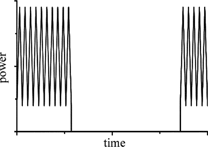 納秒脈沖的輸出由毫秒激光的脈沖有效信號(hào)控制,用以實(shí)現(xiàn)兩束激光脈沖的同步,當(dāng)毫秒脈沖寬度激光脈沖輸出時(shí)納秒脈沖激光啟動(dòng)輸出,當(dāng)毫秒激光停止輸出時(shí)停止納秒脈沖激光的輸出,兩束激光脈沖啟動(dòng)時(shí)間的延遲為微秒量級(jí)。改變毫秒激光的脈沖寬度,能夠控制一個(gè)毫秒脈沖寬度內(nèi)復(fù)合的納秒脈沖個(gè)數(shù)。兩束激光峰值功率疊加如圖 2所示。
