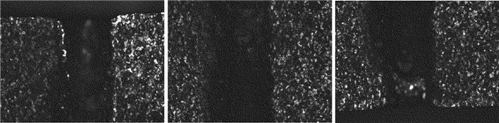 將復(fù)合脈沖激光打孔后的SUS 304不銹鋼厚板沿孔的軸向切割,在顯微鏡下觀察孔的剖面形態(tài),如圖 3所示。由于不銹鋼板較厚而顯微鏡的視場較小,5mm長的孔徑形貌需分3段拍攝,從左至右分別為孔的上、中、下3段。從圖中可以看到,小孔的入口圓度較好,出口孔徑略小于入口,孔壁略粗糙且發(fā)黑,有重鑄層。
