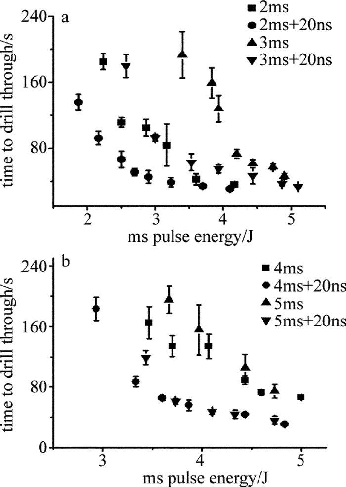比較不同毫秒脈寬下的打孔時(shí)間可知,當(dāng)毫秒脈沖能量一定時(shí),脈寬越長,打孔時(shí)間也越長。當(dāng)毫秒脈沖的能量增加到一定值后,打孔時(shí)間不再減小,打孔速率不再提高,再增加毫秒脈沖的能量沒有意義,毫秒脈沖能量存在一個(gè)值。