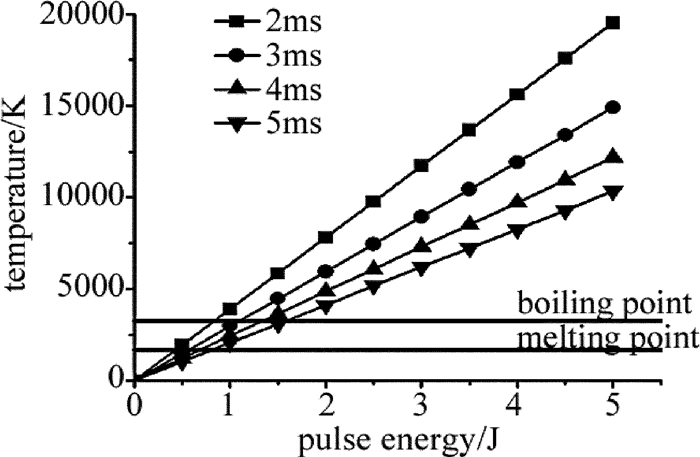 由(1)式得到不同脈寬下毫秒激光單脈沖能量與不銹鋼材料表面溫升的關(guān)系曲線,如圖 6所示。根據(jù)計(jì)算可知,使不銹鋼表面達(dá)到熔點(diǎn)所需的激光能量約為其達(dá)到沸點(diǎn)的一半。以脈寬為5ms的長脈沖為例,使不銹鋼表面達(dá)到熔點(diǎn)的單脈沖能量為0.82J,達(dá)到沸點(diǎn)的單脈沖能量為1.58J。當(dāng)脈沖能量相同時(shí),脈寬越窄,峰值功率密度越大,材料的表面溫升越高。納秒脈沖的峰值功率密度遠(yuǎn)大于毫秒脈沖,疊加后使材料表面溫度進(jìn)一步升高。