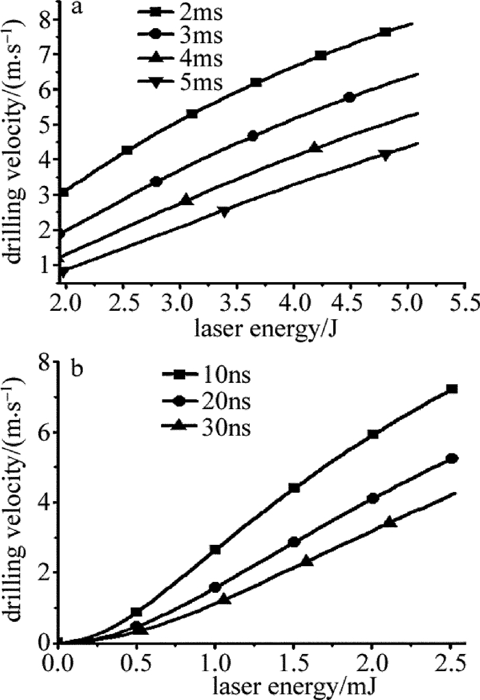 在單獨(dú)采用長脈沖打孔,考慮蒸發(fā)反沖壓強(qiáng)濺射熔融物質(zhì)為主的模型中,長脈沖激光能量加熱材料形成熔池,同時(shí)產(chǎn)生蒸發(fā)反沖壓強(qiáng)排出液體,脈寬5ms的激光單脈沖能量需大于1.58J,根據(jù)(1)式~(7)式,得到不同脈寬作用下,打孔速率與脈沖能量的關(guān)系,如圖 7a所示。